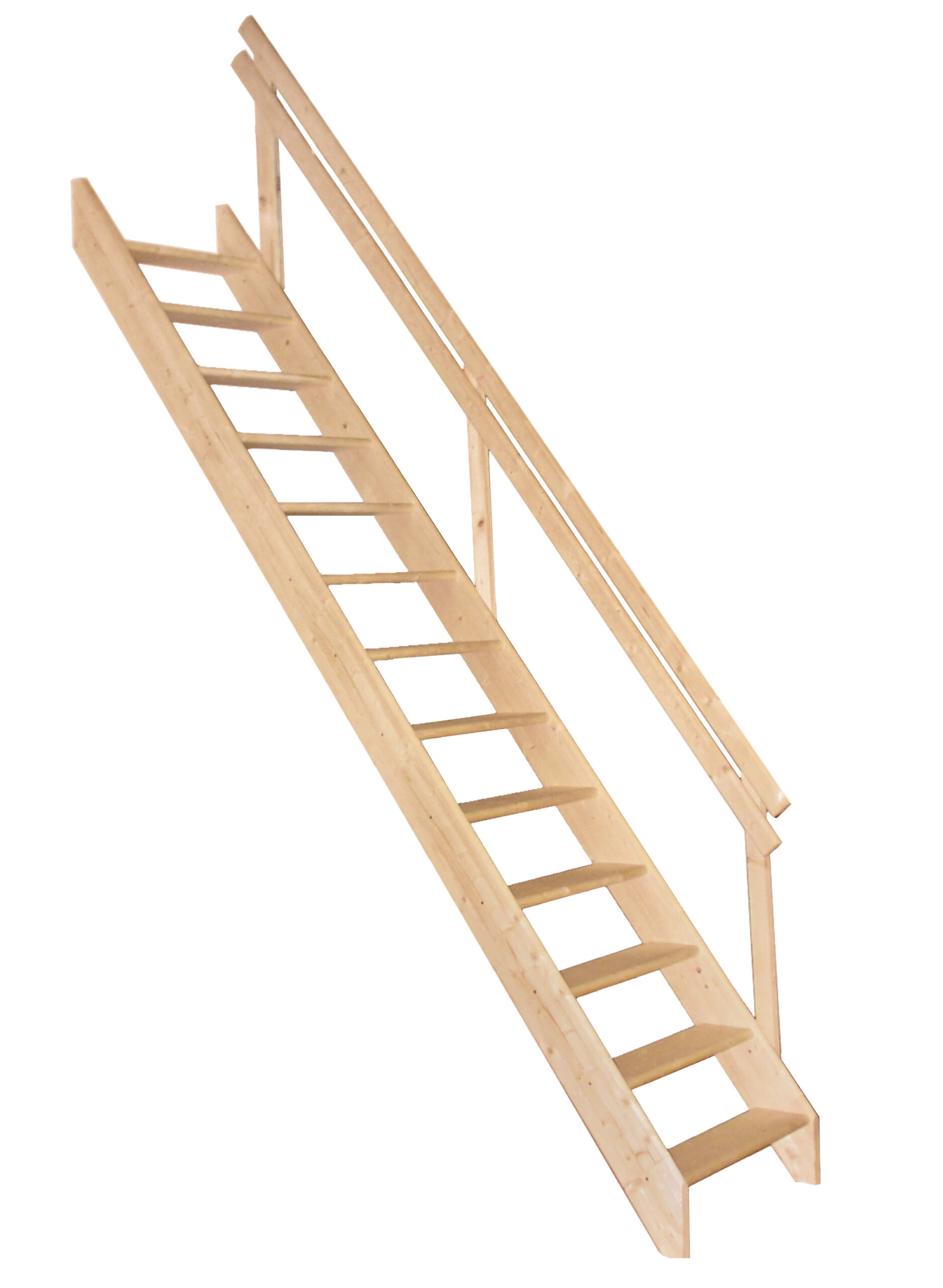 The 27 mm thick spruce treads are milled into the side stringers and are firmly screwed into place during assembly. This way, they withstand heavy loads and enable a safe and comfortable ascent and descent. The one-sided wooden handrail, which is included in the delivery of the stairs, ensures additional safety when walking on them.