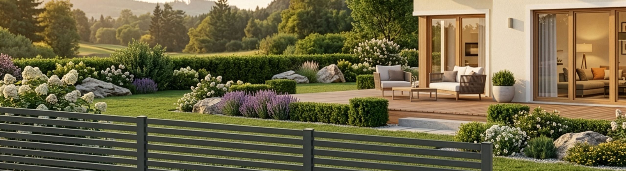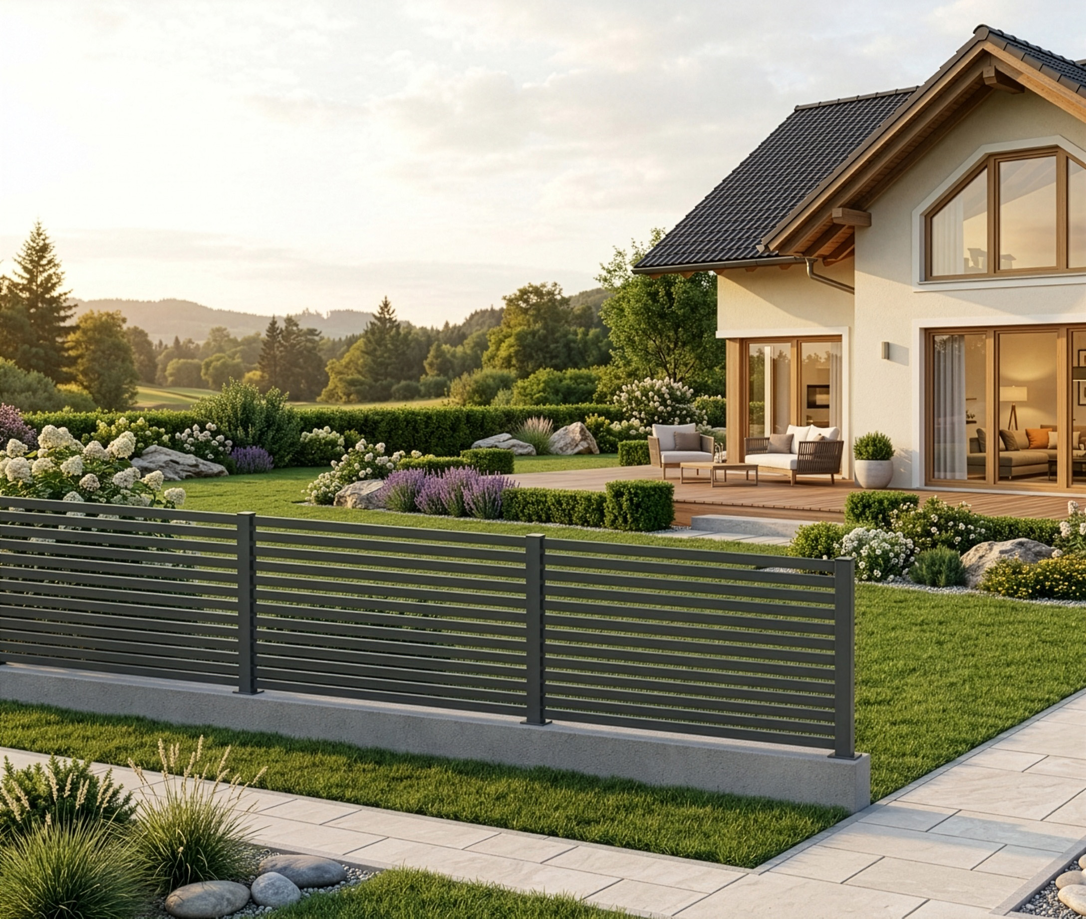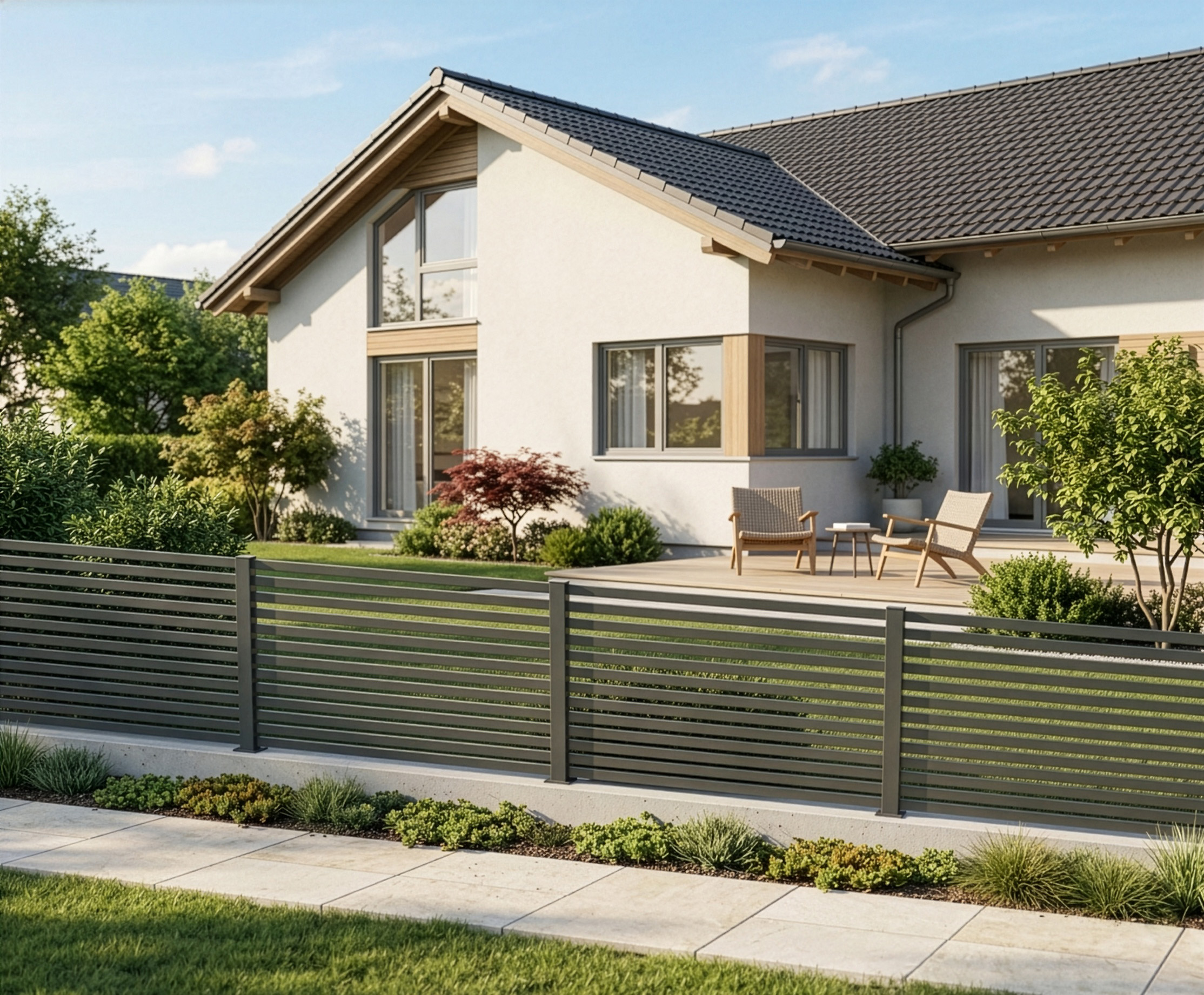 The Portico fence panel brings a modern, architectural look to outdoor spaces. Made from aluminium and finished with a matte anthracite powder coating, it has a clean, high-quality and contemporary appearance. A defining feature of Portico is its horizontal slats, which are fixed into the side adapters and give the panel its distinctive structure.