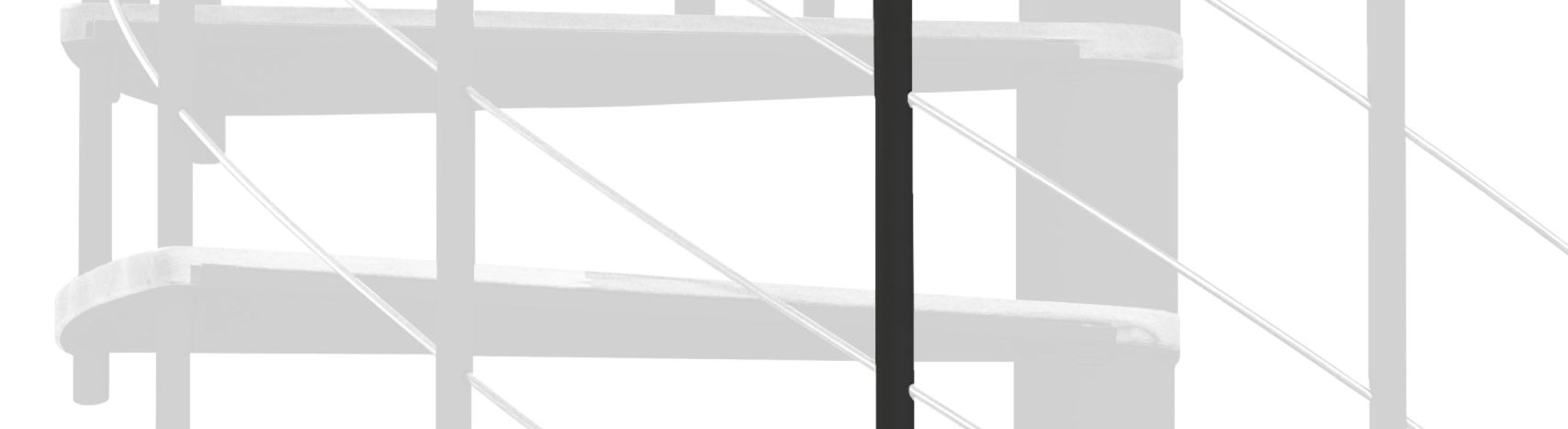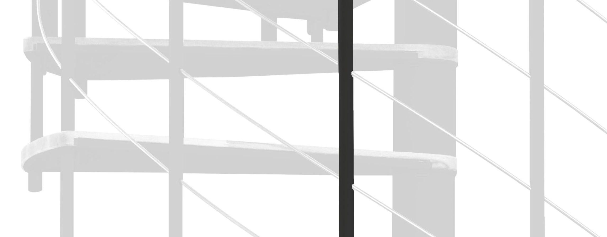 The height extension for the Fusion includes a wooden step with the steel cover, a spindle tube and various parts for the banister. These additional elements allow you to extend the Fusion spiral staircase by one step.