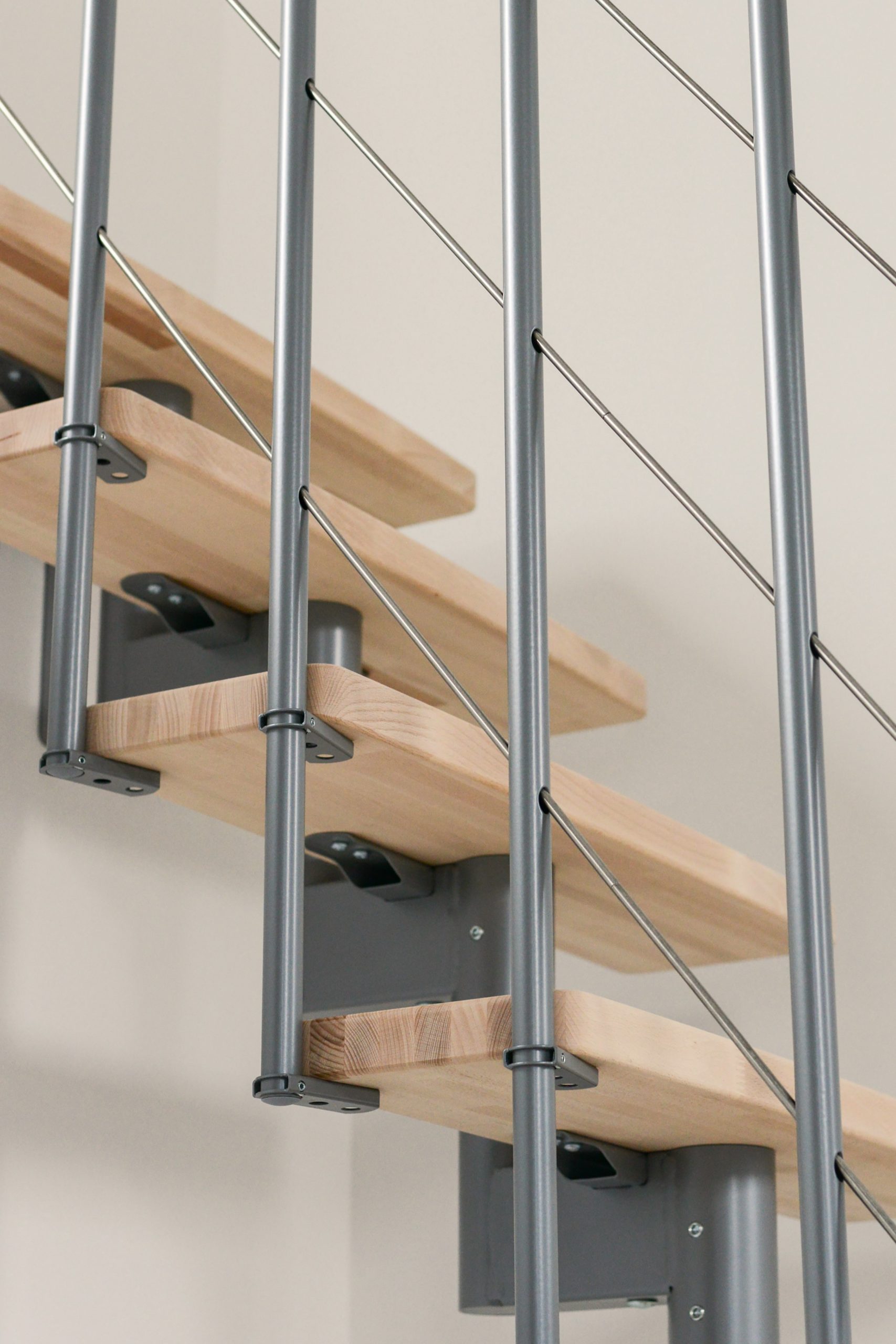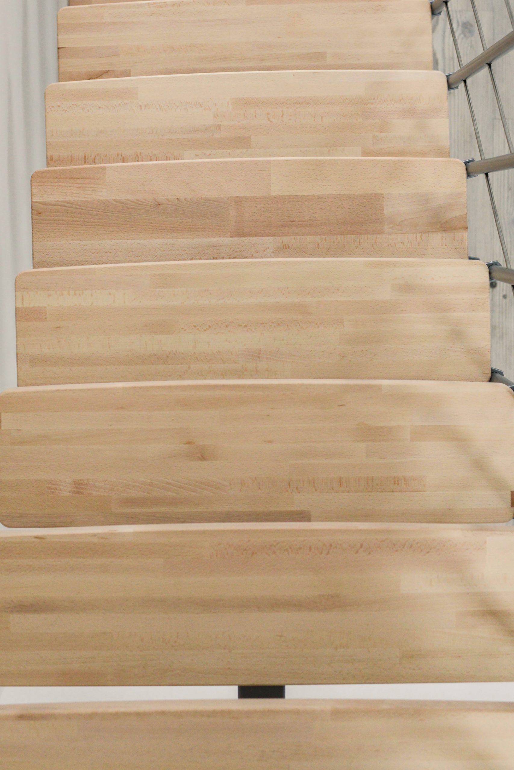 The steps of the space-saving staircase Style are available in two different wood tones: beech and walnut. The metal parts are covered with a fine-textured powder coating and can be ordered in black, grey or white. This allows you to combine the wood and metal elements as you wish and create an individual look for your home.