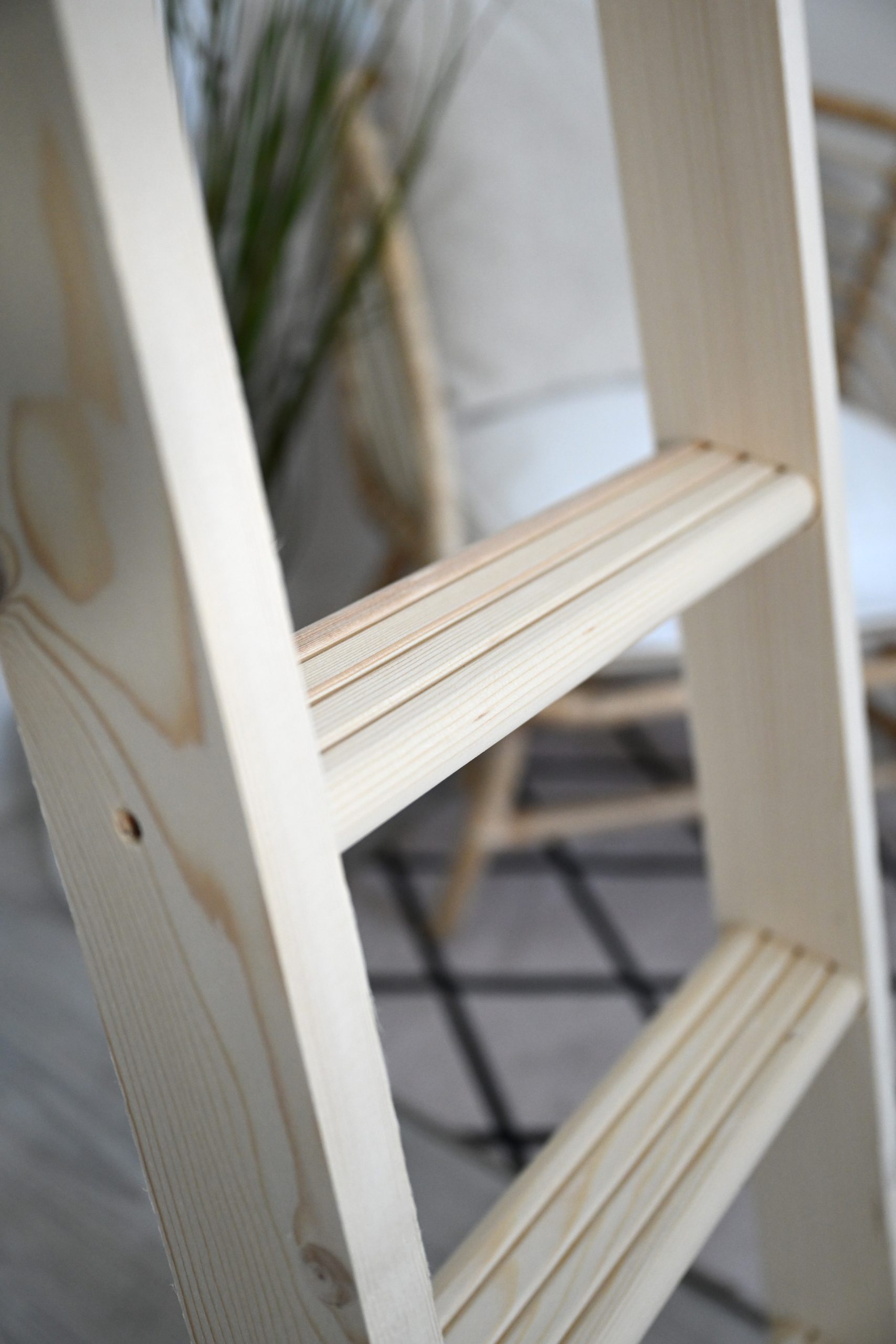 The ladder is made of high-quality, natural spruce wood, which provides a warm and natural look and is stable and durable. The brackets on the wall are made of powder-coated steel, which ensures high load-bearing capacity and durability.