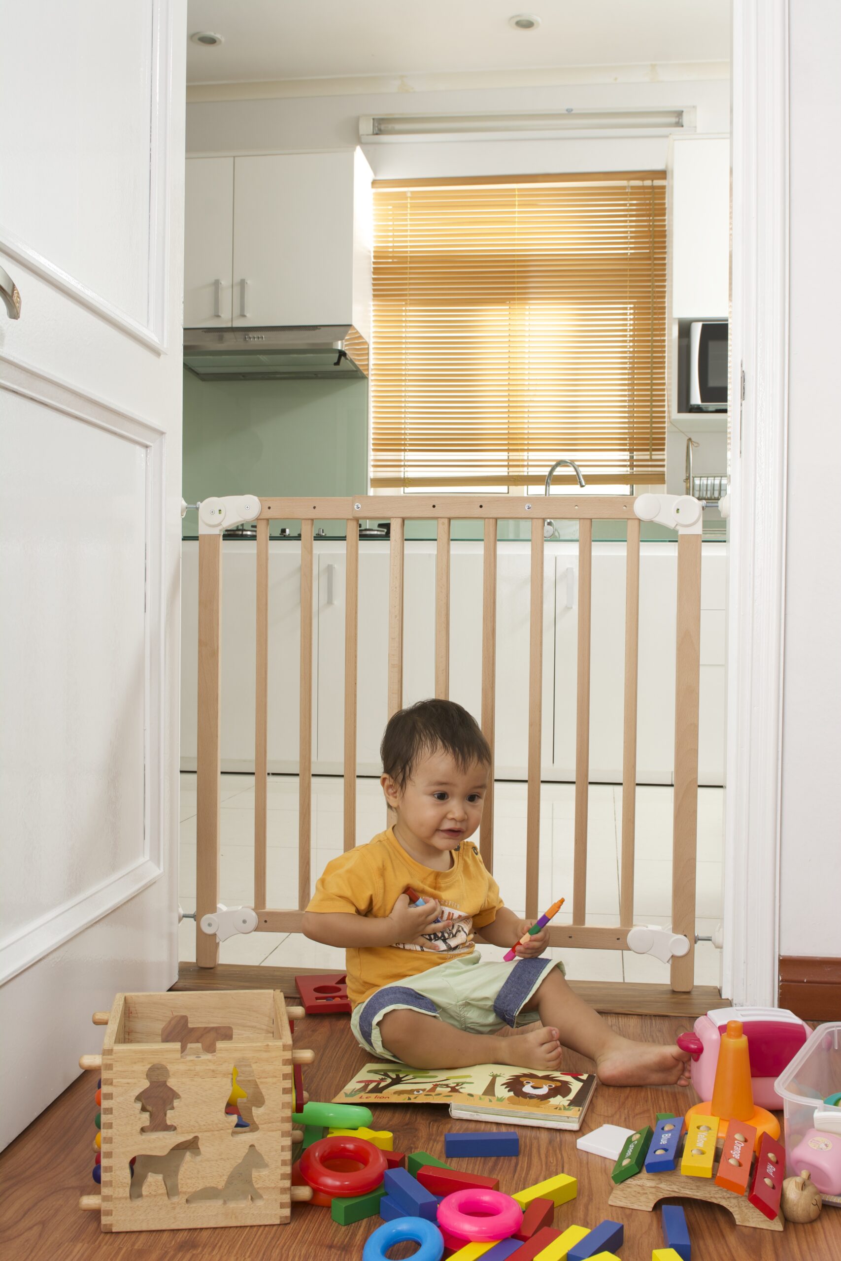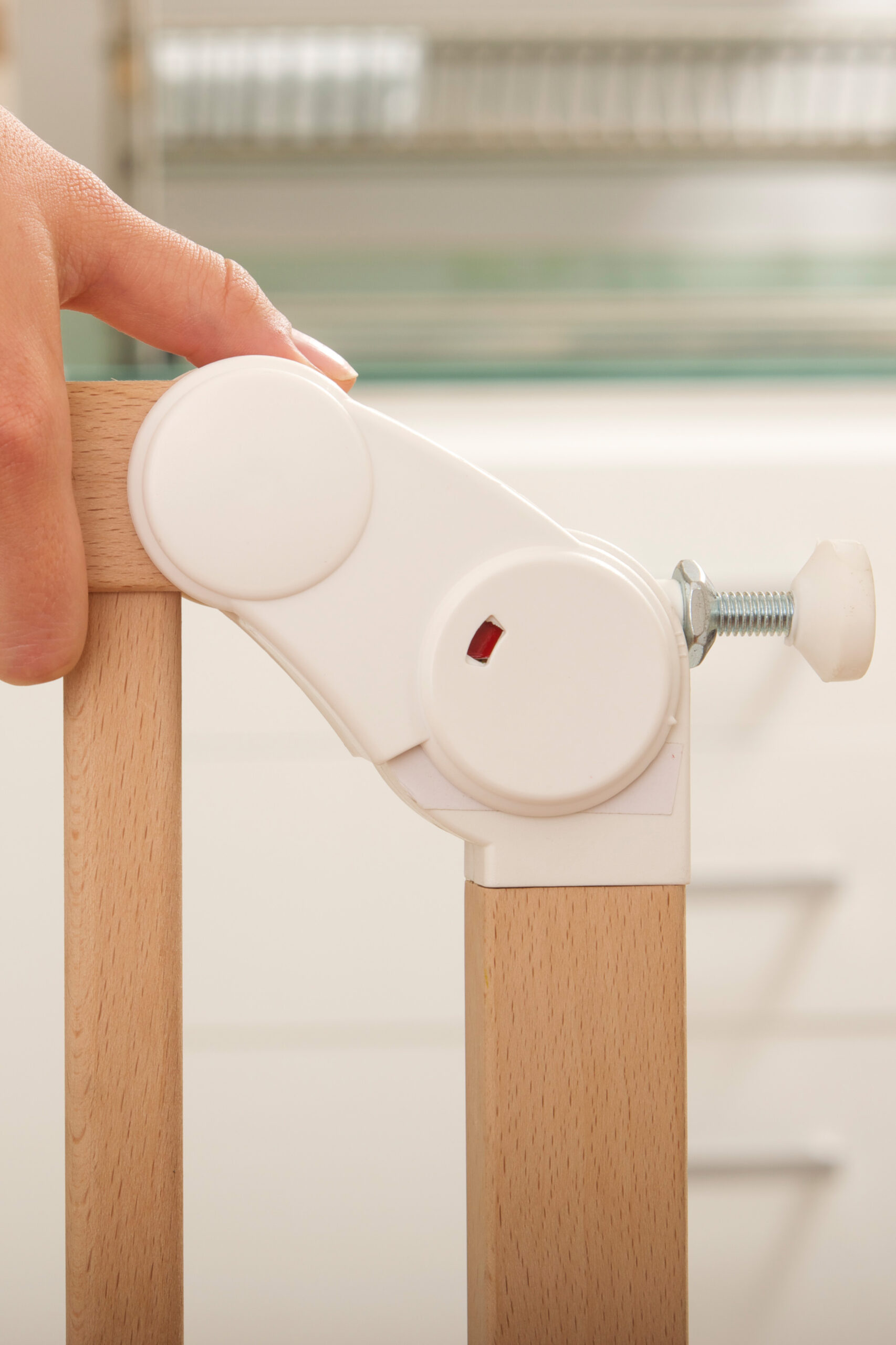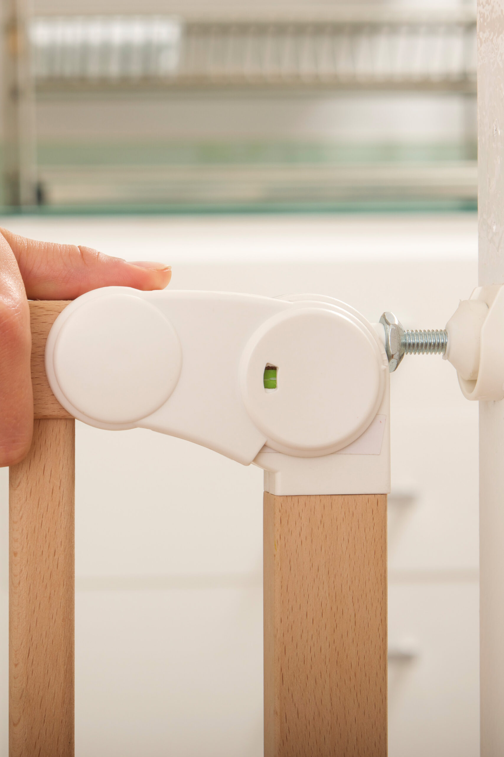 Die Sicherungstür Annika besteht aus hochwertigem Hevea-Holz und punktet mit einer hohen Stabilität. Mit einer Höhe von 77 cm ist sie sowohl zum Schutz von Kindern unter zwei Jahren als auch von Haustieren geeignet. Diese bleiben im sicheren Raum, während sich das Schutzgitter von Erwachsenen leicht öffnen lässt.
