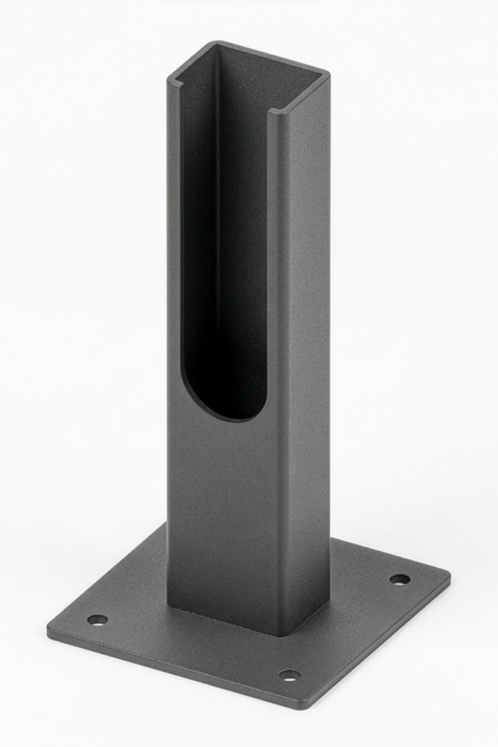 Gefertigt aus Aluminium und pulverbeschichtet in mattem Anthrazit, fügt sich die Grundkonsole optisch perfekt in das Design der Minka Zaunanlage ein. Der Fuß misst 15 x 15 cm, das obere Rohr 7 x 5 cm und ist damit passend auf die Konstruktion abgestimmt.