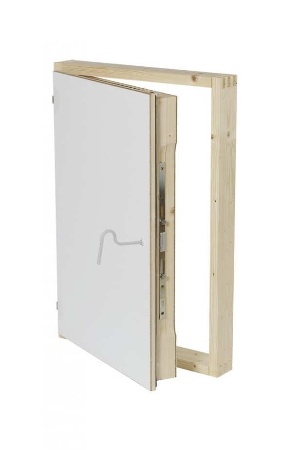 Die Revisionstür aus Holz ist in vier verschiedenen Größen erhältlich. Der Rahmen misst Länge mal Breite entweder 79×54, 109×54, 59×59 oder 69×69 cm. Die Deckelstärke beträgt bei allen Varianten 87 mm, wodurch sich ein hervorragender U-Wert von 0,4 W/m2K ergibt.