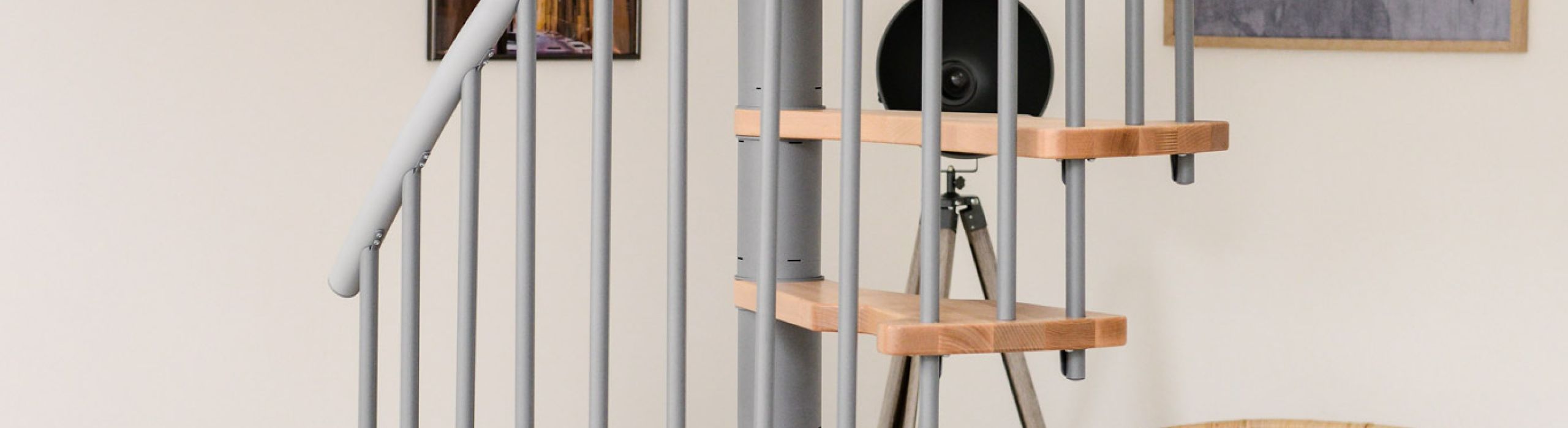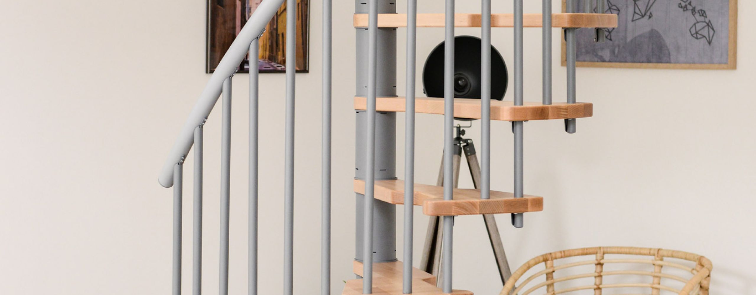 • Platzsparende Spindeltreppen mit Stufen aus massivem Buchenholz