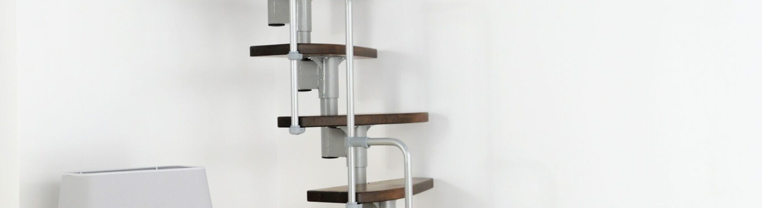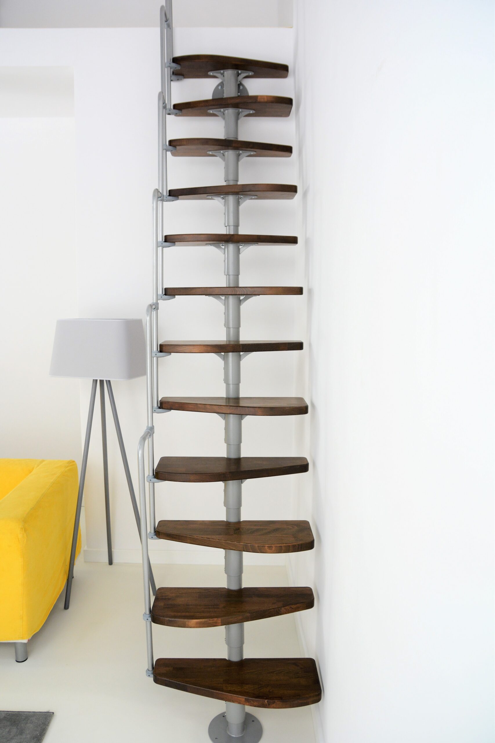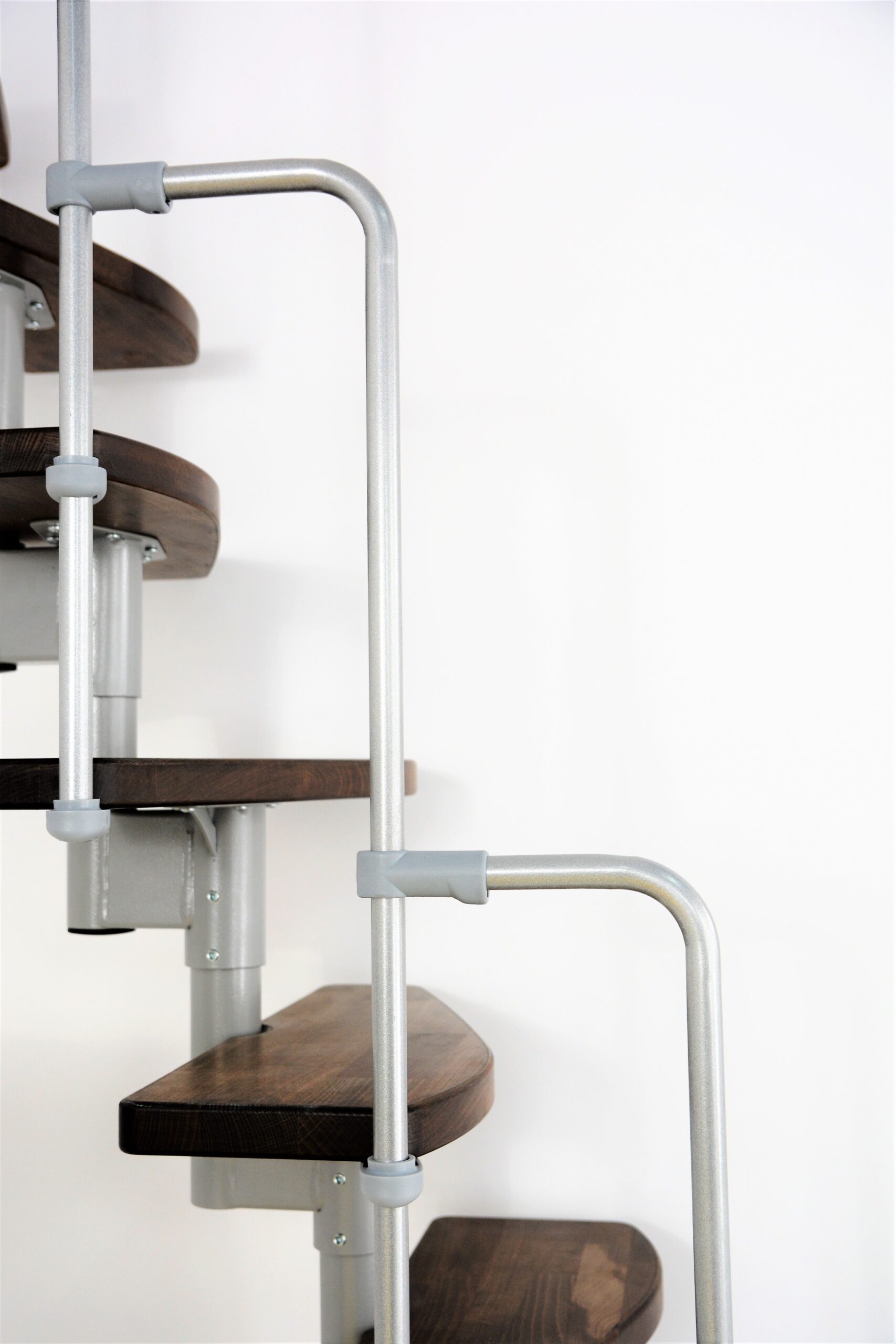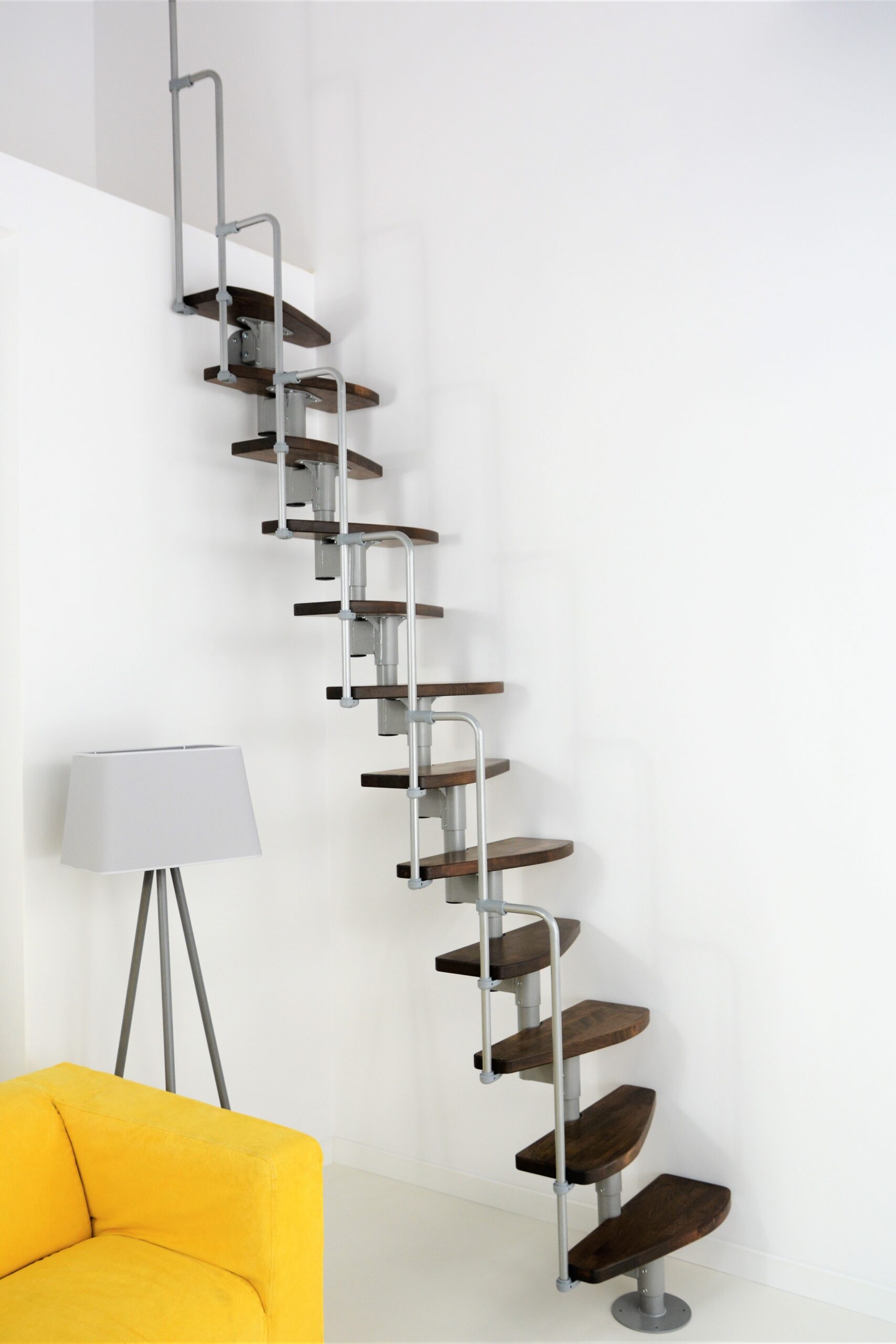 Die einseitig begehbaren Stufen der Monaco sind in zwei verschiedenen Farben verfügbar. Wer es heller mag, greift am besten zu naturbelassenem Buchenholz. Kontrastreicher sind hingegen die auf Walnussoptik gebeizten Stufen. Je nach Wunsch können Sie bei den Metallteilen zwischen den Farben Schwarz, Grau und Weiß wählen. Dank der flexiblen Trageelemente der Monaco lässt sich die Monaco gerade oder auch leicht nach links bzw. rechts gewendelt montieren.