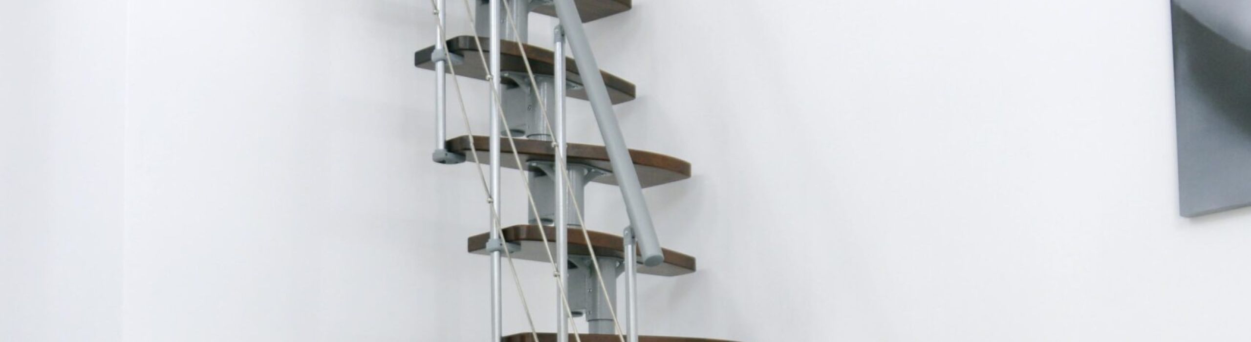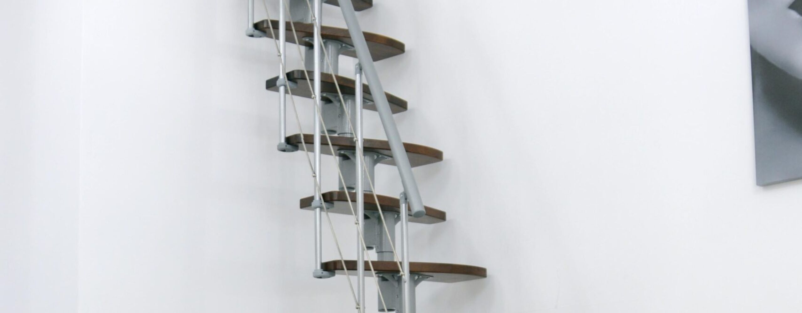 Die Raumspartreppe Nizza zeichnet sich durch flexible Montagemöglichkeiten aus. Sie können Ihre Treppe entweder gerade aufbauen oder mit einer leichten Drehung nach links oder rechts. Aber auch farblich gibt es mehrere Optionen: Die Stufen der Nizza bestehen aus Buchenholz, das entweder nur lackiert oder auch auf eine dunklere Walnussoptik gebeizt werden kann. Die Metallteile und der Handlauf aus PVC können passend dazu in Schwarz, Grau oder Weiß pulverbeschichtet werden.