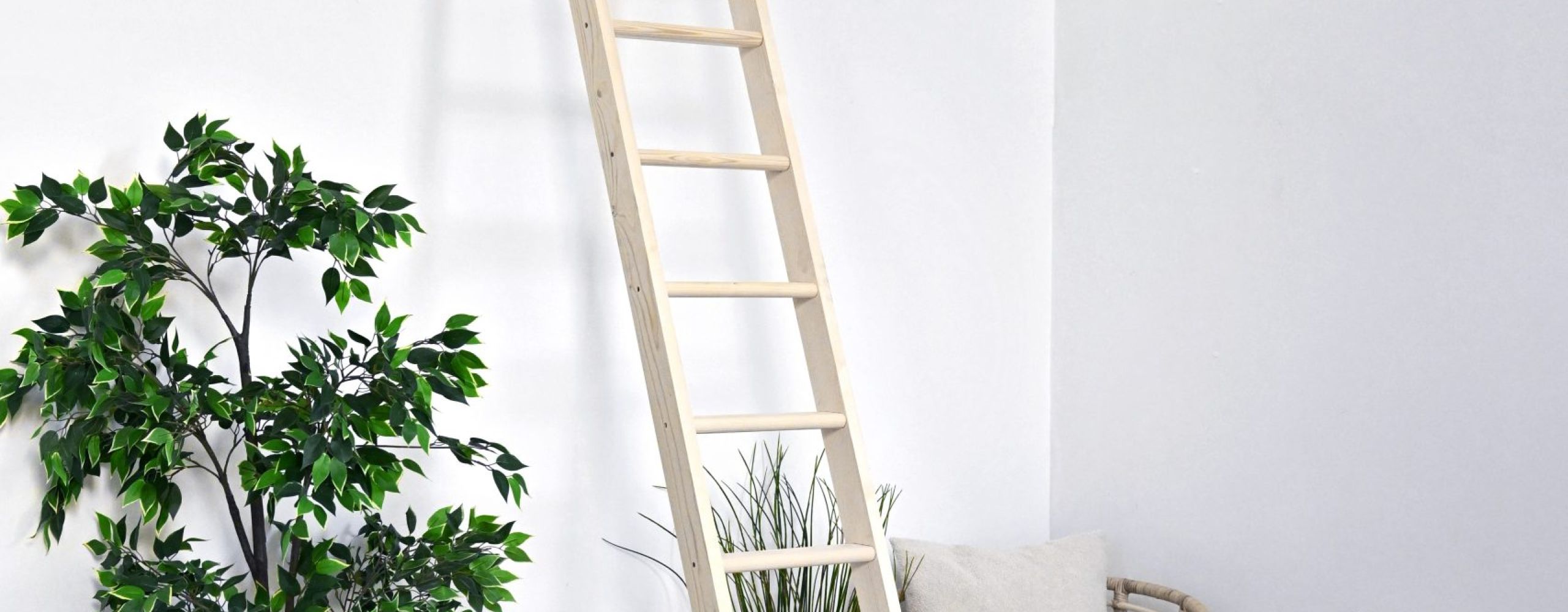 Die Leitertreppe Woody ist eine platzsparende und elegante Lösung für Innenräume. Sie wird an der Wand befestigt und kann nach der Benutzung in eine senkrechte Position geschoben werden, sodass sie kaum Platz einnimmt und optisch dezent wirkt.